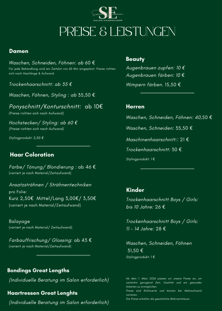 Unsere Preise spiegeln nicht nur die reine Dienstleistung wider, sondern auch unsere Erfahrung, Weiterbildung, Auszeichnungen, die Qualität unserer Produkte und den Anspruch, dir ein großartiges Ergebnis zu schenken.
